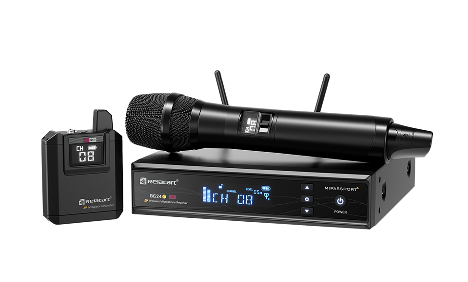 BG-24 is a newly launched 2.4G digital wireless microphone system from the Relacart MIPASSPORT series. The appearance is simple and elegant, made of strong and durable alloy; the high-brightness OLED display can clearly display the working status of the device. Optional handheld microphone wireless charging base makes charging management more convenient; it uses ISM's global unrestricted 2.4GH frequency band for transmission and can be used in any area. Relacart independently develops digital audio algorithms, allowing the host to have ultra-low latency transmission; it is fully suitable for small and medium-sized performances, business negotiation venues, conference rooms, schools, home entertainment and other occasions.
